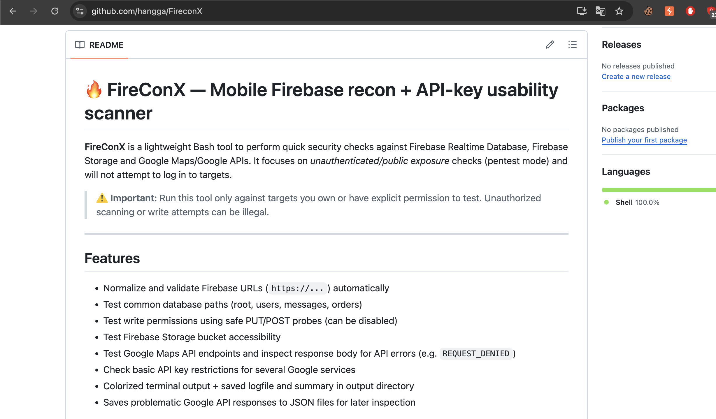 FireConX is a lightweight Bash tool to perform quick security checks against Firebase Realtime Database, Firebase Storage and Google Maps/Google APIs. It focuses on unauthenticated/public exposure checks (pentest mode) and will not attempt to log in to targets.